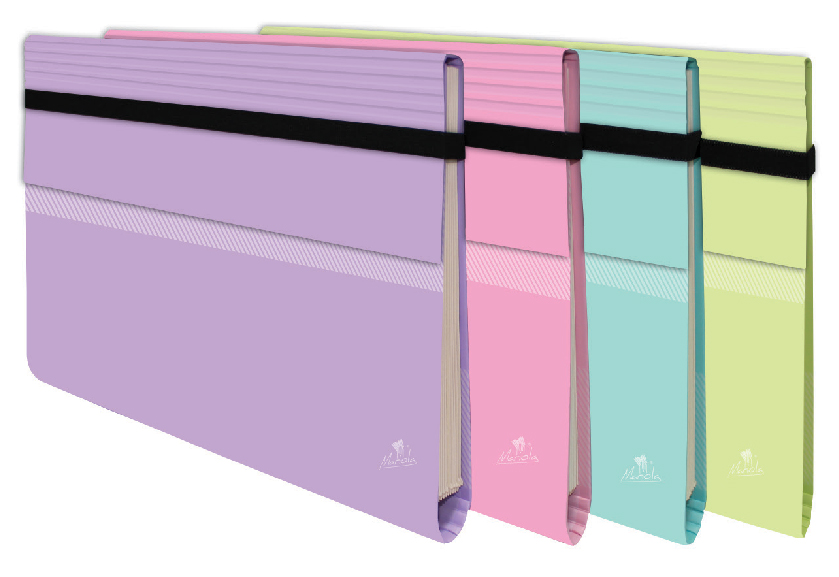 CARPETA FUELLE CON SOLAPA ACORDEÓN 12 BOLSAS CARTÓN FORRADO EN PAPEL PASTEL PLASTIFICADO MATE CIERRE GOMA ANCHA