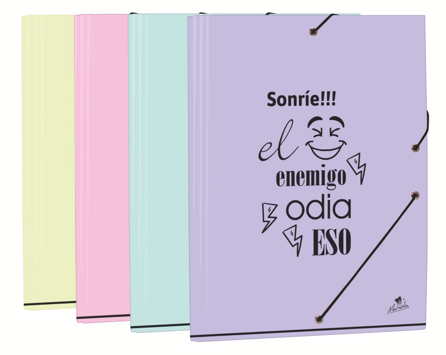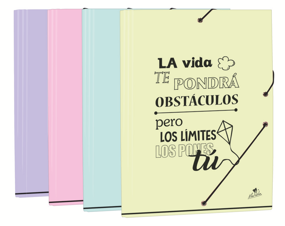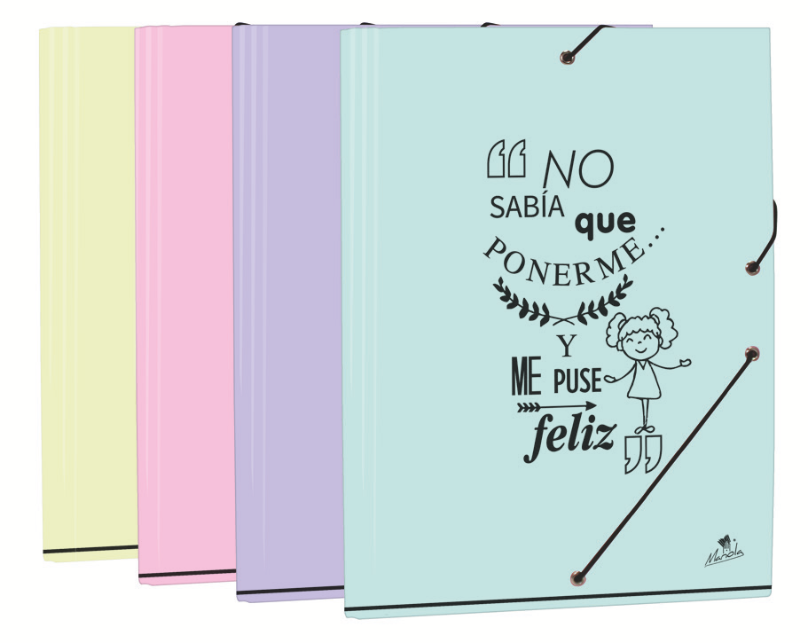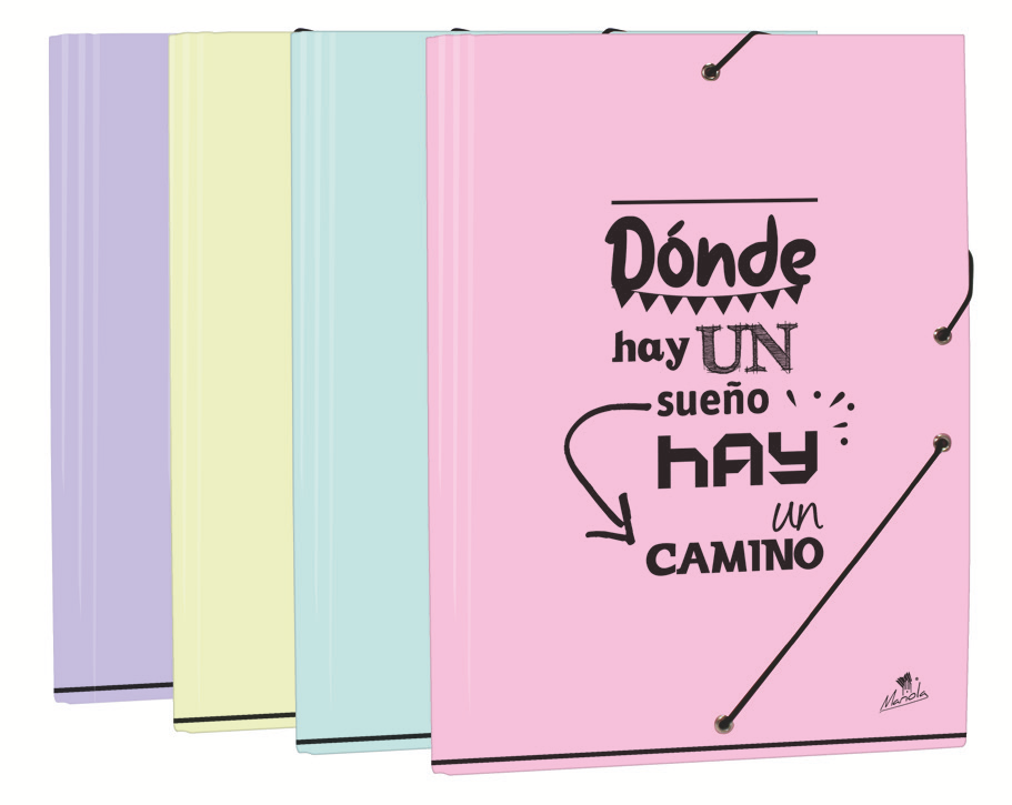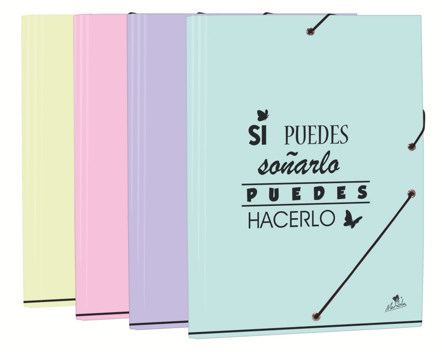 EXPOSITOR 24 CARPETAS GOMA Y SOLAPAS CARTÓN FORRADO EN PAPEL PASTEL PLASTIFICADO MATE CON FRASES