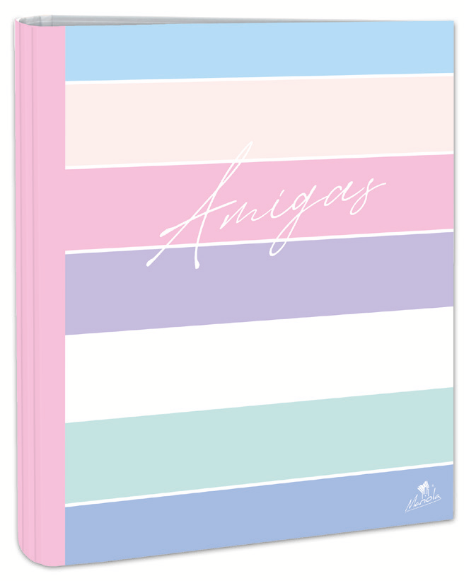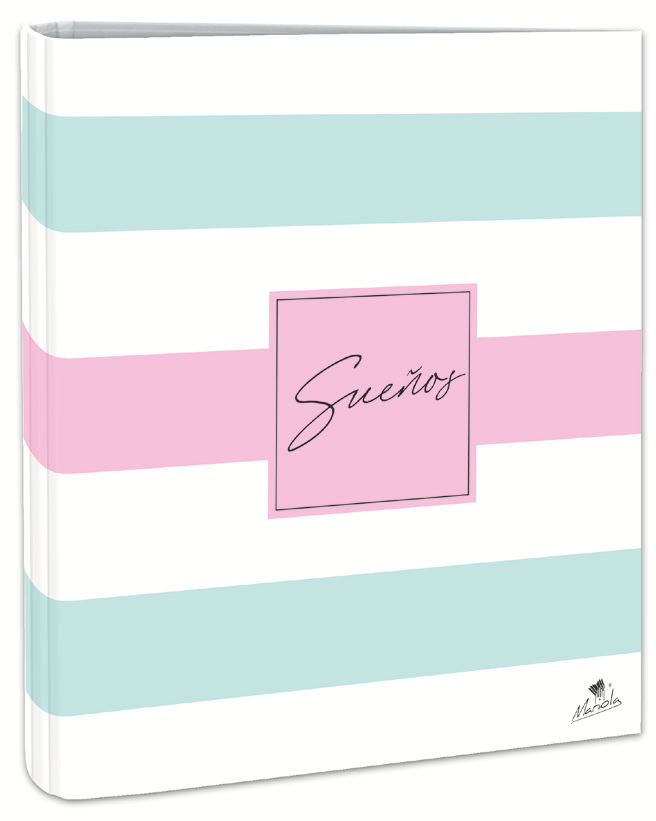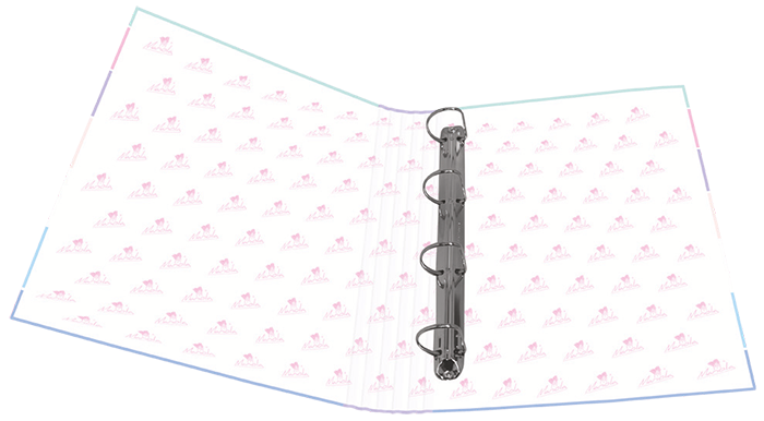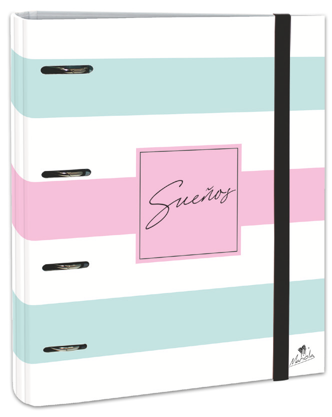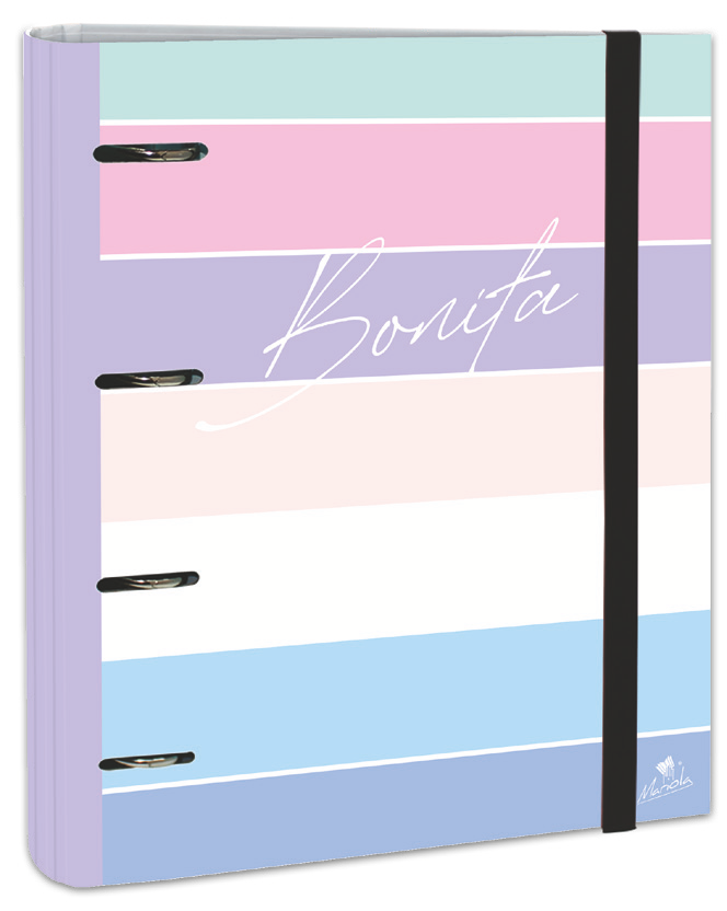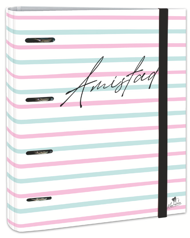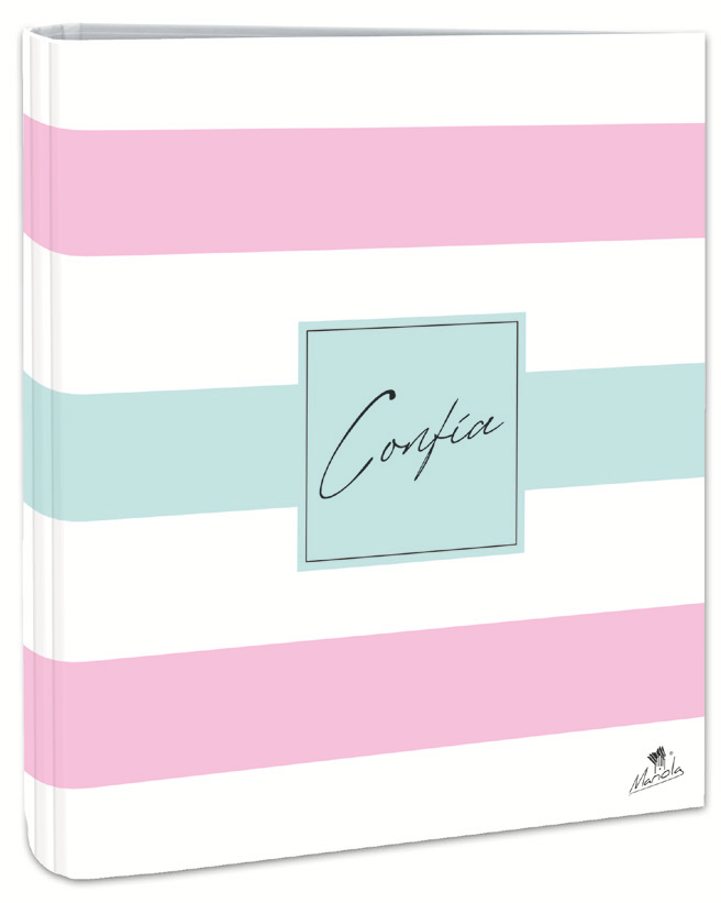 EXPOSITOR CON 12 CARPETAS 4 ANILLAS 40 MM CARTÓN FORRADO EN PAPEL PASTEL PLASTIFICADO MATE CON FRASES